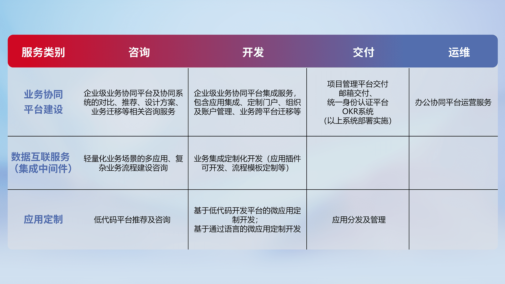 针对钉钉、、、企微、、IDaas等平台级产品提供产品的规划、、、、方案、、、、交付、、、定制化开发等服务,,,,实现如统一协同办公、、、智能客户服务、、、、混合会议管理、、智能数据查询、、等业务场景,,,,实现数字化转型。。